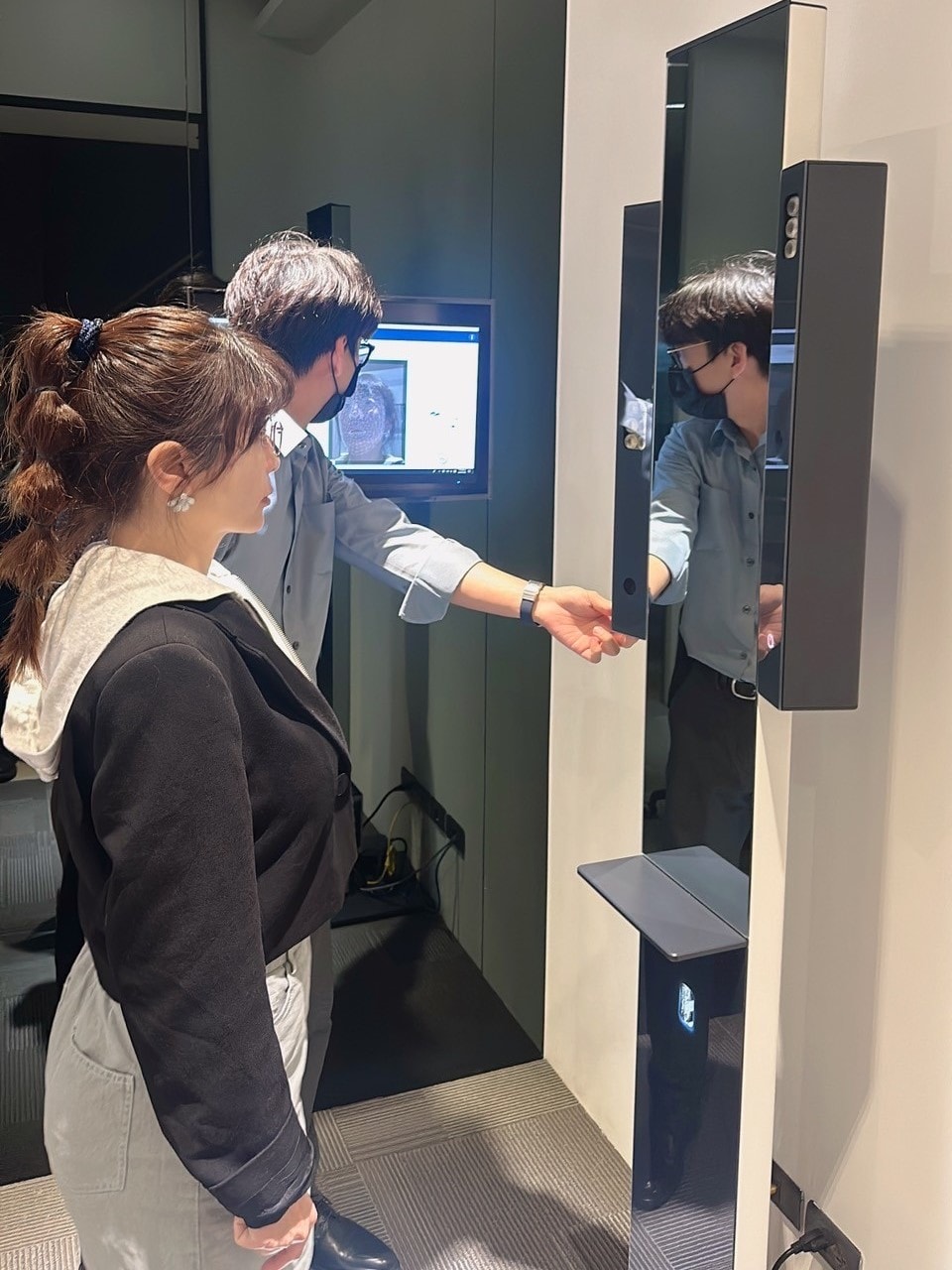 每個人的眼睛、耳朵一定會有些微高低差,這台儀器能更精確的知道差距,這樣一來眼鏡配好就可以微調高度。